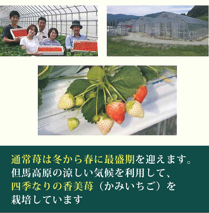 生産地の兵庫県美方郡香美町は 9年連続金賞受賞の「但馬村岡米」やブランド牛、但馬牛でも有名なほど 水、土、空気がよく、美味しいイチゴが育つ環境が整っています。