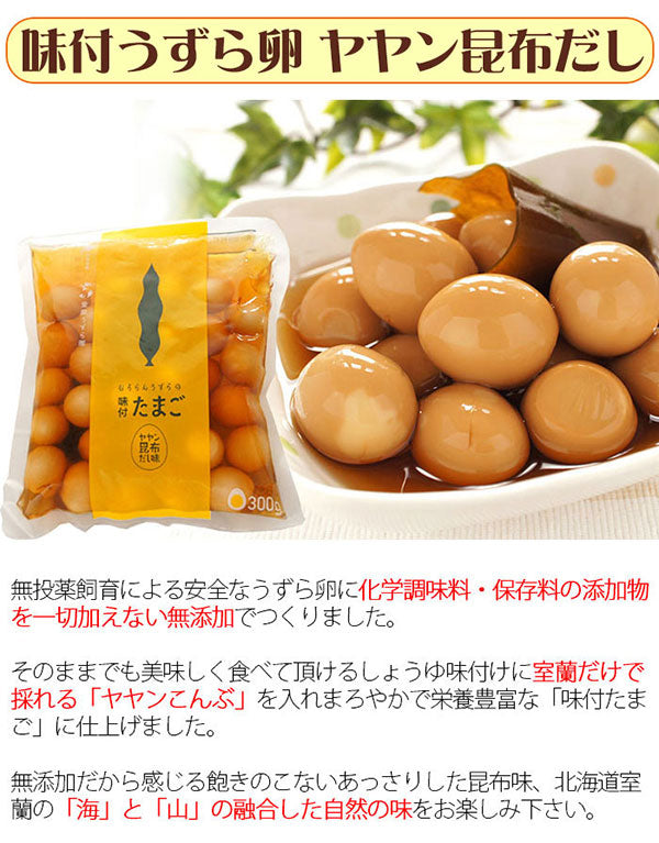 そのままでも美味しく食べて頂けるしょうゆ味付けに室蘭だけで採れる「ヤヤンこんぶ」を入れまろやかで栄養豊富な「味付たまご」に仕上げました。
