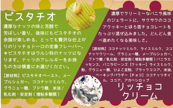 ピスタチオペースト、メープルシュガー、ココナッツミルク、グラニュー糖、ブドウ糖、米油/乳化剤・安定剤(増粘多糖類)
