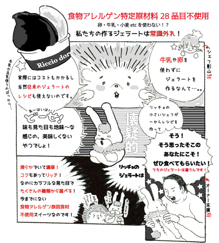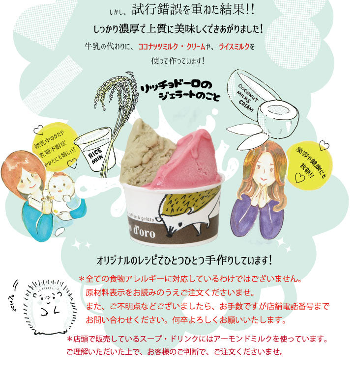 ※リッチョドーロのジェラートは、表示「義務」+「推奨」を合わせた28品目を不使用としていますが、ココナッツミルク、ピスタチオ、ヘーゼルナッツなどを使用しております。