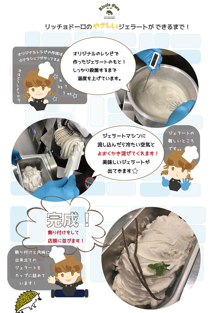 リッチョドーロの作るジェラートは、濃厚な味、なめらかな口当たり、そして、ちゃんと美味しい、まさに本場イタリアで食べることができるジェラートです。
