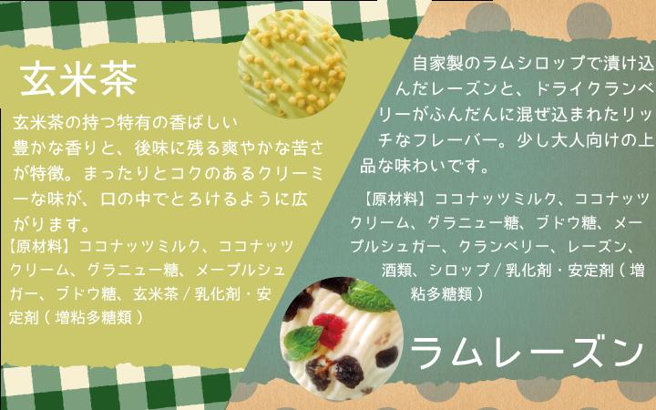 ココナッツミルク、ライスミルク、ココナッツクリーム、ブドウ糖、グラニュー糖、メープルシュガー/乳化剤・安定剤(増粘多糖類)、バニラエッセンス、バニラビーンズ
